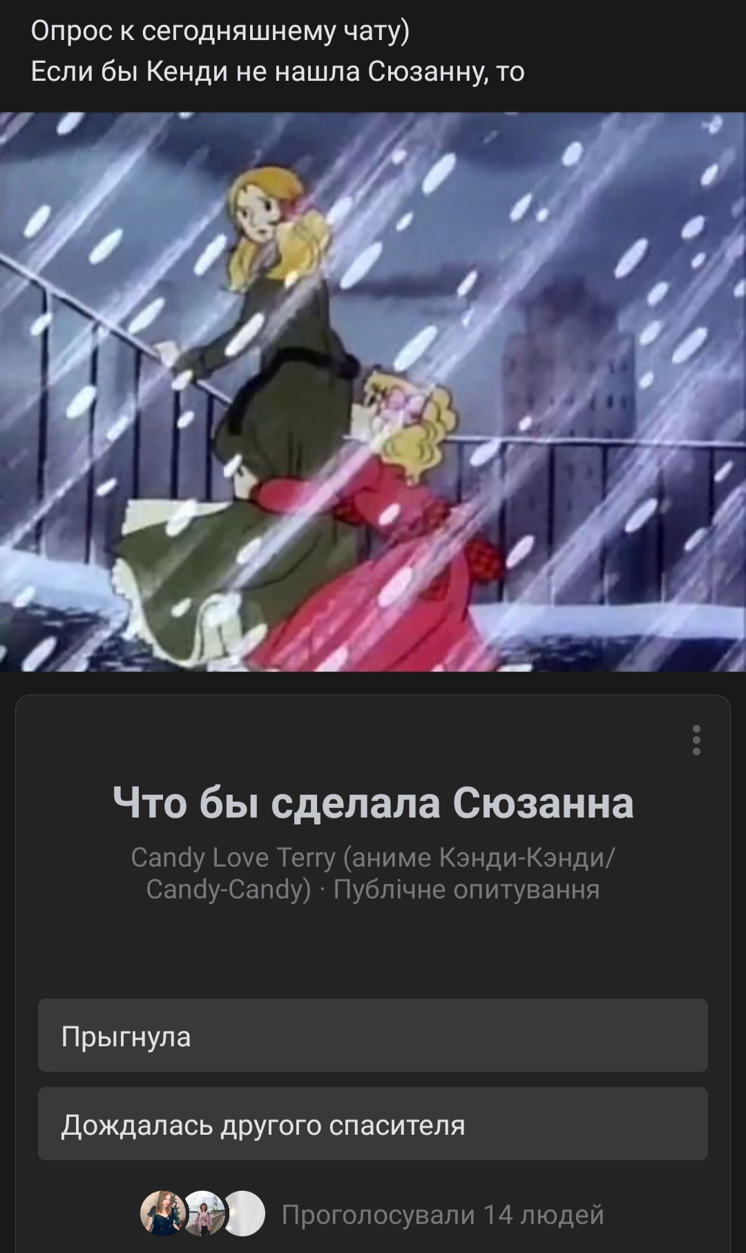 Jony, да опрос из вк. Вчера там отвечала. Я думаю, что она не спрыгнула бы. Если бы хотела, то сделала бы это. А так постояла, размышляла о своей горькой судьбе, и надеялась, что ее кто-то увидит.