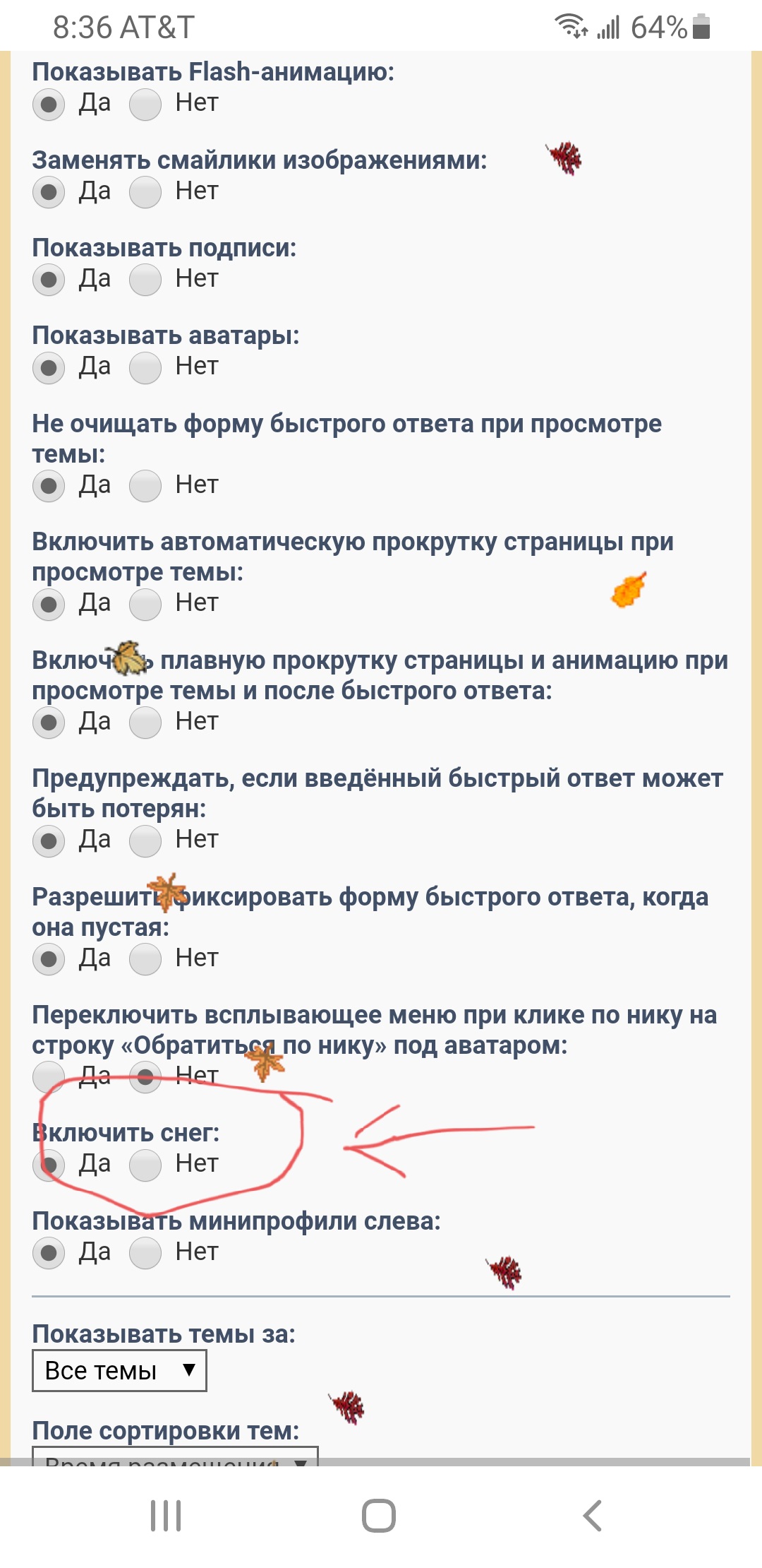 Листья можно отключить в личном кабинете. Настройки отображения -> включить снег
