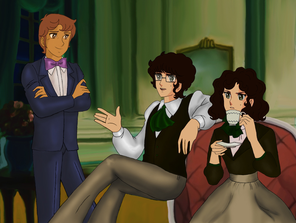 Рисовать "кузена Даниэля" в тандеме с Кенди показалось мне уж очень банально. Решила изобразить подросшего и образумевшегося Нила с новыми знакомыми- близнецами фром Фрэнс. Леди Эндри же весьма негостеприимно забылась сном и почивает перед камином.