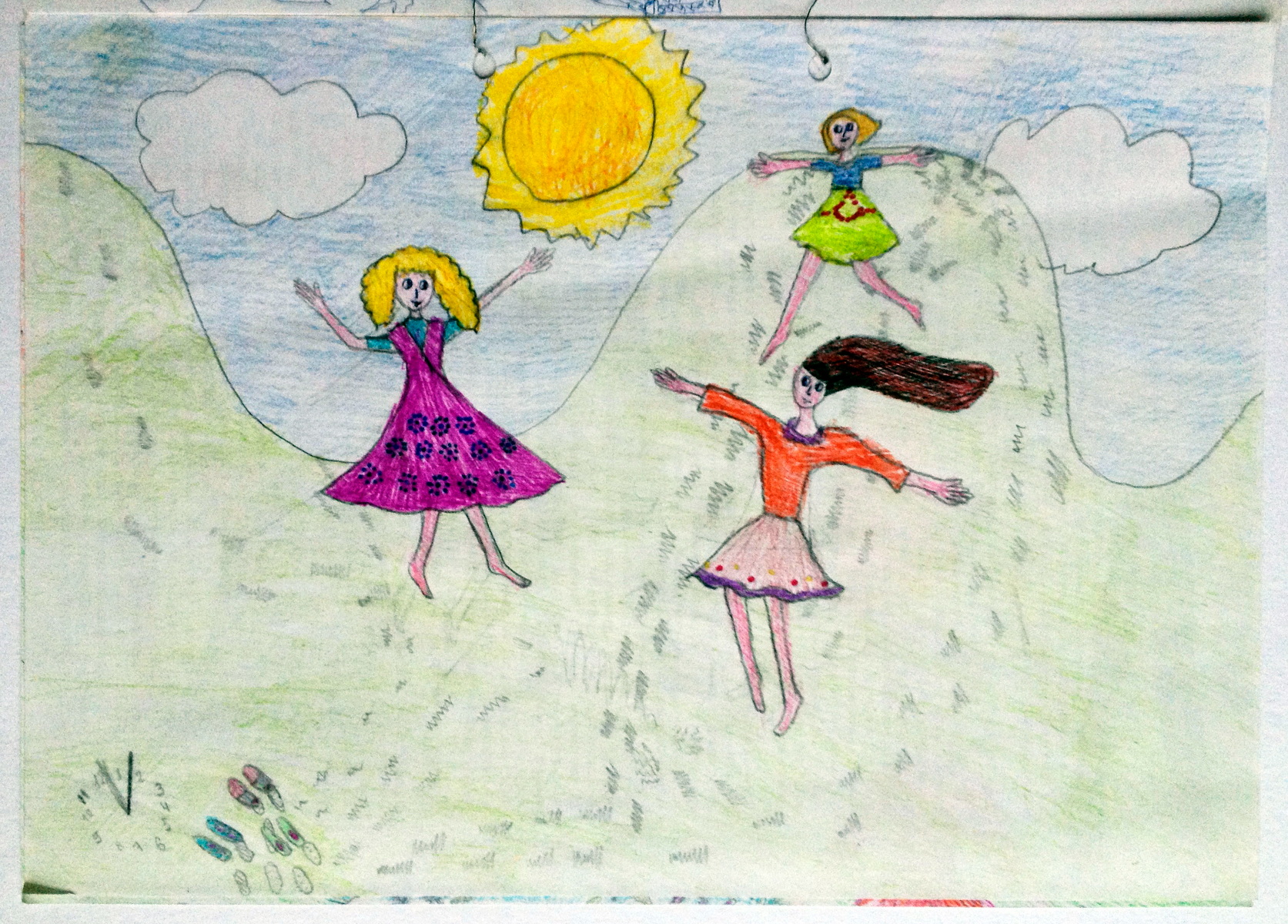 Следы на траве оставаться не должны, так что, думаю, нарисовала я их либо потому, что не знала этого, либо для того, чтобы было видно, как много они бегали. Внимание к деталям - три пары туфелек стоят в сторонке. И солнечные часы. Я всегда мечтала их сделать в реальности, но вроде бы этого так и не произошло. Опять же, всё это сделано, чтобы говорить нам о том, что они просто веселились, играли и делали что хотели.
